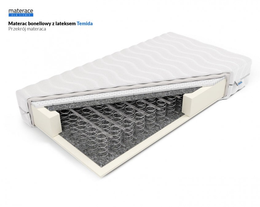 Materac Temida to model zbudowany z połączenia sprężyn bonellowych w ilości 108szt. na m2. Z jednej strony jest umieszczona pianka FlexyLateks o grubości 2 cm, natomiast z drugiej strony znajduje się pianka ComfortBase (poliuretanowa). Grubość wkładku materaca wynosi 16 cm. Łączna grubość materaca zależeć będzie od wybranego pokrowca. Produkcja materaca następuje w ciągu 24h od zaksięgowania środków za zamówienie. Produkt objęty jest 10-letnią gwarancją na wkład sprężynowy.