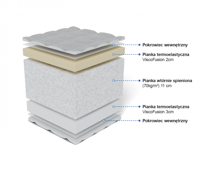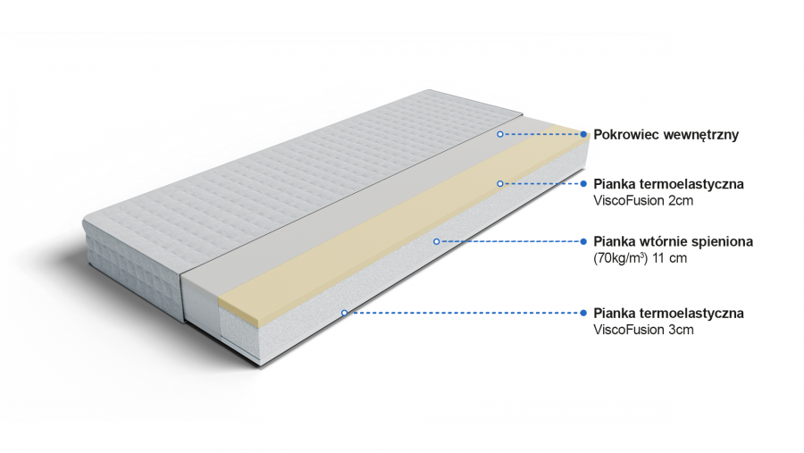Obustronnie zastosowanie znalazła pianka termoelastyczna ViscoFusion, która idealnie dopasowuje się do naturalnych krzywizn ciała. Materac dopasowuje się poprzez nacisk oraz tempertaturę ciała. Pianka termoelastyczna jest świetnym rozwiązaniem w profilaktyce schorzeń kręgosłupa – niweluje nadmierny ucisk oraz poprawia krążenie krwi. Pianka termoelastyczna poprawia komfort snu, przyśpiesza proces regeneracji naszego organizmu. Środek materaca to bardzo wytrzymała pianka wtórnie spieniona, która sprawia, że materac jest odporny na odkształcenia (pianka posiada gęstość aż 70 kg/m3) – jest to bardzo stabilna baza materaca.
