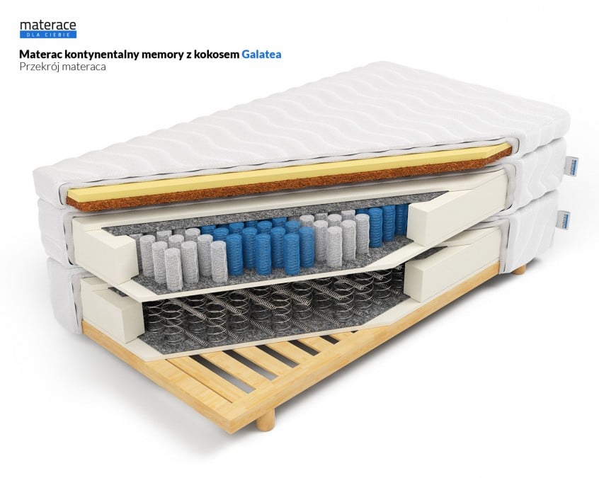 Galatea jest materacem, który łączy w sobie trzy różne warstwy. Każda z tych warstw posiada osobny antyalegiczny pokrowiec. Warstwa dolna to materac bonellowy, którego ułożenie sprężyn daje nam niezwykle elastyczną powierzchnię do snu. Są one bardzo wytrzymałe i odporne na duże obciążenia. Dodatkowo warstwa ta ma wbudowany stelaż z drewna sosnowego. Stelaż posiada możliwość przykręcenia nóżek o wysokości 10 cm. Do każdego zamówienia dołączany jest komplet nóżek. Warstwa środkowa to materac kieszeniowy o 7 strefach twardości. Każda ze sprężyn zaszyta jest w osobnej kieszonce i odpowiednio ułożona w strefach. Takie rozłożenie zapewnia idealne podtrzymanie wszystkich części ciała. Ten system szczególnie polecany jest dla par, nie ma tutaj efektu zapadania się materaca w kierunku cięższej osoby. Trzecia warstwa składa się z dwóch komponentów. Poniżej znajduje się 3 cm wkład w postaci kokosu lateksowanego, który podnosi stopień twardości materaca. Mata kokosowa jest również niezwykle trwała, odporna na odkształcenia, dzięki niej materac jest przewiewny. Odpowiednia cyrkulacja powietrza sprawia, że materac oddycha i jest antyalergiczny. Ostatnim z komponentów jest 2-centymetrowy wkład z pianki PerfectSuite (VISCO/memory), która posiada właściwości termoelastyczne. Kiedy kładziemy się na materacu, pod wpływem ciepła naszego ciała, pianka dopasowuje się do jego konturów, kiedy traci ciepło wraca do swojego pierwotnego kształtu. Dzięki temu zapobiega bólom pleców, szyi i okolicy ramion – miejsc, które są szczególnie wrażliwe na ucisk. Wszystkie komponenty użyte w materacu posiadają właściwości antyalergiczne.