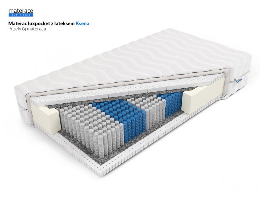 Materac Ksena jest to model zbudowany z Formatki kieszeniowej LuxPocket 7 stref w ilość 1000 szt. sprężyn na m2 oraz obustronnej wysokiej jakości pianki FlexyLateks, o grubości 4 cm. Sprężyny o różnym stopniu twardości zostały rozmieszczone w 7 strefach, tak aby zapewnić odpowiednie podparcie poszczególnym częściom ciała. Każda sprężyna została zapakowana w oddzielną kieszeń, dzięki czemu materac ugina się tylko w punktach nacisku. Grubość wkładu materaca wynosi 20 cm. Łączna wysokość materaca zależeć będzie od wybranego pokrowca. Produkcja i wysyłka materaca następuje w ciągu 10 dni roboczych od momentu zaksięgowania wpłaty za zamówienie. Produkt objęty jest 5-letnią gwarancją na wkład sprężynowy.