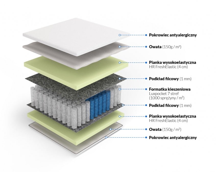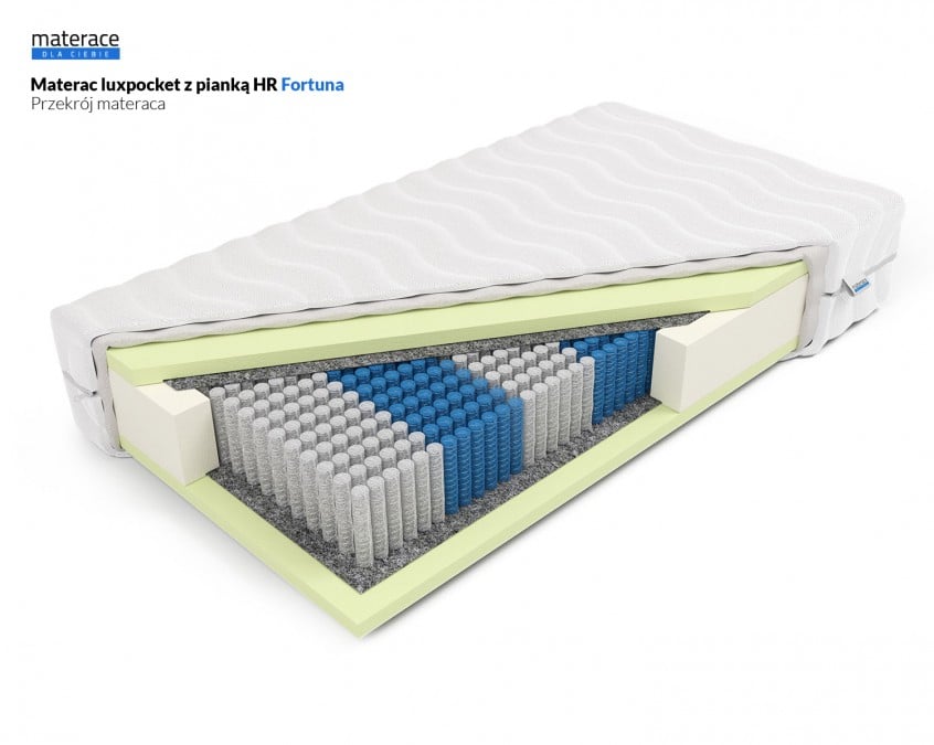 Fortuna to materac luxpocket, który posiada wkład w postaci sprężyn w kieszonkach. Każda sprężyna pracuje niezależnie, więc materac ma wiele punktów podparcia. Jest to rozwiązanie polecane szczególnie dla par, ponieważ kieszeniowy system sprężyn ugina się tylko w miejscach, na które wywierany jest nacisk. Dzięki temu ruchy jednej osoby nie są odczuwalne po drugiej stronie materaca. Dodatkowo obustronna warstwa pianki HR FreshElastic zwiększa komfort snu przez niwelowanie ucisku na poszczególne części ciała, który może być powodowany przez długotrwałe przebywanie w jednej pozycji. Pianka HR FreshElastic ma w swojej budowie miliony pęcherzyków, co zapewnia doskonałą wentylację materaca. Pianka HR FreshElastic cechuje się również dużą trwałością i odpornością na odkształcenia. Wszystkie komponenty użyte w materacu posiadają właściwości antyalergiczne.