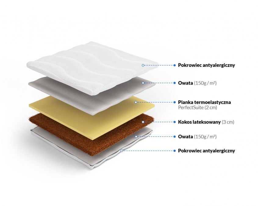 Do materaca dołączony jest antyalergiczny pokrowiec. Cena pokrowca wliczona jest w cenę materaca. Posiada on dodatkowo z obu stron warstwę owaty, która nadaje mu puszystość i miękkość. Dzięki zamkowi błyskawicznemu zdjęcie pokrowca jest niezwykle proste.