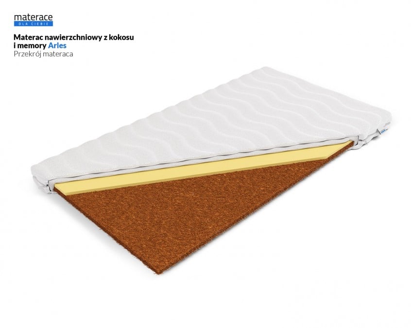 Materac Arles jest materacem nawierzchniowym, zaliczanym do grupy średnio twardych. Pełni on rolę nakładki na materac, tapczan lub wersalkę. Ma on za zadanie poprawić jakość snu, poprzez wyrównanie powierzchni. Ważną rolę odgrywają 3 cm kokosu lateksowanego – nadaje on materacowi niezwykłą trwałość. Dzięki zastosowaniu tej warstwy możemy wyrównać powierzchnię, na której śpimy i nadać jej wyższą jakość. Materac posiada właściwości antyalergiczne i antygrzybicze. Drugą warstwę materaca stanowią 2 cm pianki PerfectSuite (VISCO/memory). Pianka ta dostosowuje się, pod wpływem temperatury, do kształtu ciała. W ten sposób odciąża najbardziej problematyczne strefy naszego kręgosłupa – odcinek szyjny i odcinek lędźwiowy. Ma też za zadanie zmiękczenie materaca. Materac nie przenosi drgań, dlatego też będzie odpowiednim wyborem dla par.