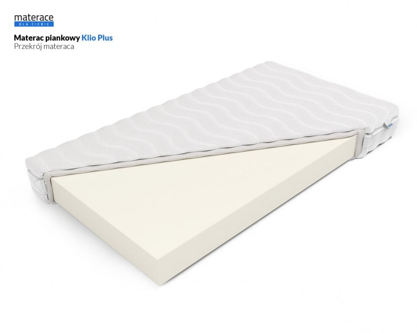 Materac Klio Plus jest modelem o średniej twardości (H2). Nie posiada wkładu sprężynowego i stanowi wygodne podłoże do snu. Pianka ComfortBase zapewnia optymalne ułożenie ciała na materacu, co podnosi komfort snu, i w znaczący sposób wpływa na jego jakość. Materac Klio plus, ze względu na budowę wkładu, może być użytkowany obustronnie. Model Plus został dodatkowo wzbogacony o pas wentulujący, który odpowiada za prawidłową cyrkulację powietrza w materacu. Model ten został wykonany przy użyciu środków, które nie wywołują alergii, dzięki czemu jest bezpieczny dla astmatyków i alergików. Klio Plus nie przenosi drgań, dlatego też polecany jest dla par.