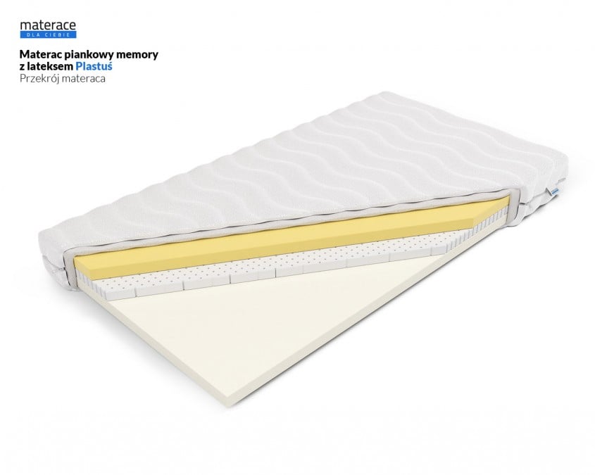 Materac Plastuś to materac, który reaguje nie tylko na nacisk, ale także na temperaturę ciała. Dzięki temu doskonale podtrzymuje kręgosłup małego dziecka. Podczas snu pianka PerfectSuite, której wkład ma wysokość 5 cm (znana także pod nazwą pianka VISCO lub memory), dopasowuje się do anatomicznej budowy ciała. Pianka PerfectSuite ma właściwości ortopedyczne (zmniejsza bóle kręgosłupa) oraz znajduje zastosowanie w profilaktyce antyodleżynowej. Warstwa z pianki FlexyLateks, dzięki strefom twardości sprawia, że materac ma odpowiednią twardość w każdym punkcie. Dzięki podwójnej warstwie pianki: PerfectSuie i pianki FlexyLateks, materac Plastuś zapewnia optymalną podporę dla ciała podczas snu. Wszystkie komponenty użyte w materacu posiadają właściwości antyalergiczne.