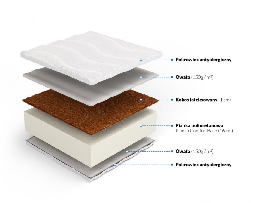 Wkład materaca jest dwuwarstwowy. Bazę stanowi pianka ComfortBase o grubości 16 cm. Jest to najnowszej generacji pianka poliuretanowa, która jest bardzo odporna na odkształcenia. Posiada ona przewiewną strukturę, która zapewnia zdrowy i spokojny sen. Pianka ComfortBase została wyposażona we wzmocnienia na krawędziach, które zapobiegają deformacjom nawet przy siadaniu na bokach materaca. Na warstwie pianki została ułożona warstwa kokosu lateksowanego o grubości 1 cm. Kokos nadaje odpowiednią twardość całej konstrukcji, zapewnia stabilne podparcie dla sylwetki oraz odprowadza wilgoć i zapewnia prawidłową cyrkulację powietrza wewnątrz materaca. Przepływ powietrza jest ułatwiony również dzięki wszytej wzdłuż boków materac taśmie wentylującej. Takie połączenie materiałów sprawia, że materac ma działanie antyalergiczne i antygrzybiczne, więc odpowiedni jest dla alergików.