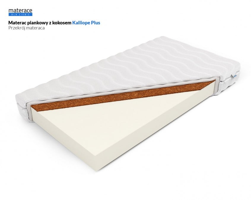 Materac Kalliope Plus jest materacem piankowym, który dodatkowo został wzbogacony warstwą kokosu lateksowanego. Posiada on stopień twardości H3, czyli twardy, będzie więc najbardziej komfortowym rozwiązaniem dla osób o wadze powyżej 80 kg oraz tych preferujących twardszą powierzchnię spania. Jest to bardzo komfortowe rozwiązanie o wysokim stopniu odporności na odkształcenia. Materac, dzięki grubej warstwie pianki Comfort Base (poliuretanowej), doskonale amortyzuje ciężar ciała. Jego wysokość to 18 cm, łączna wysokośc materaca zależeć będzie od wybarnego pokrowca. Produkcja materaca następuje w ciągu 24h od zaksięgowania wpłaty za zamówienie. Produkt objęty jest 2-letnią gwarancją na wkład z pianki oraz matę kokosową.