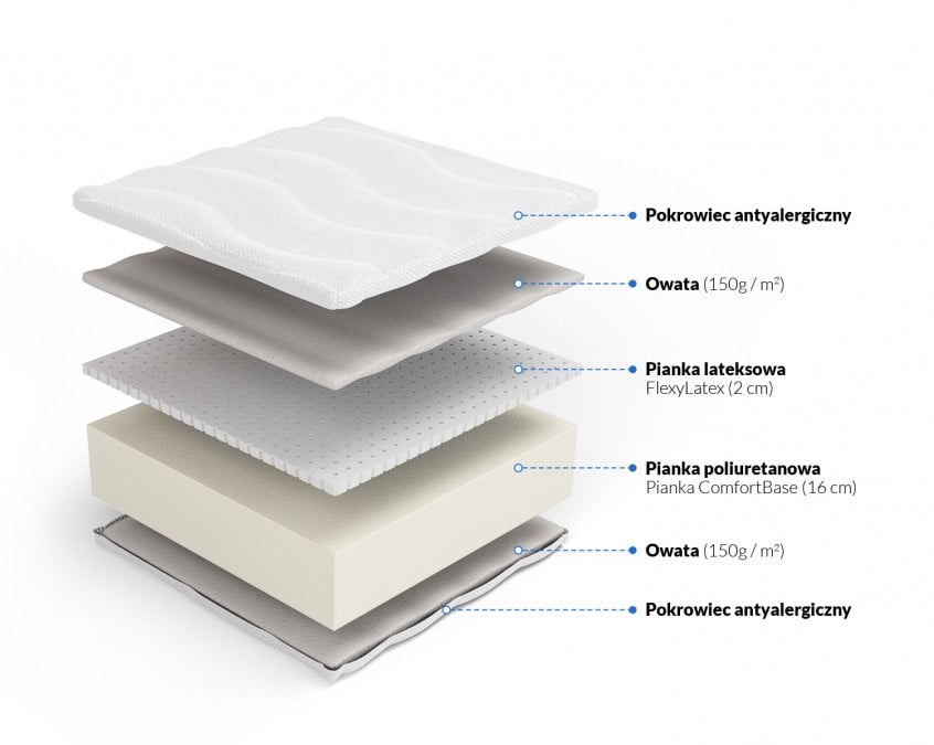 Wkład materaca został wykonany z pianki poliuretanowej i lateksu. Warstwa z pianki poliuretanowej posiada 16 cm grubości. Jest to baza materaca, która nadaje odpowiedniej twardości oraz zapewnia amortyzację sylwetki. Pianka ta ma porowatą strukturę, która ułatwia dopasowanie do kształtu ciała i zapewnia dobry przepływ powietrza w materacu. Warstwa ta posiada wzmocnienia na krawędziach, dzięki którym materac nie deformuje się przy obciążeniu jego boków, np. częstym siadaniu. Na warstwie pianki poliuretanowej ułożono lateks o grubości 2 cm. Pianka ta powstała z mieszaniny lateksu naturalnego 20% i syntetycznego 80%. Dzięki swojej budowie, lateks zapewnia właściwości antyalergiczne, antybakteryjne i antygrzybiczne. Dodatkowo charakteryzuje się wysokim stopniem sprężystości, doskonale dopasowuje się do kształtów ciała i nadaje właściwości ortopedycznych materacowi. Materac jest bardzo wygodny, a dzięki porom w strukturze pianki i wszytej w boki pokrowca taśmie wentylującej, posiada odpowiednią cyrkulację powietrza i absorbuje nadmiar wilgoci. Materac można użytkować dwustronnie.