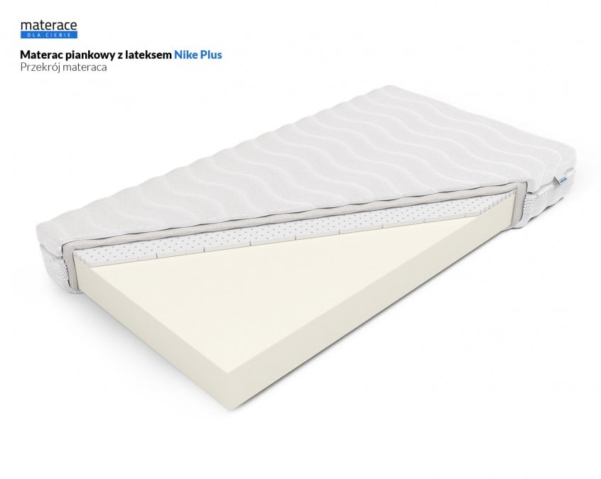 Nike Plus to materac w całości wykonany z pianki. Stanowi on połączenie dwóch rodzajów doskonałej jakości pianek: FlexyLateks i ComfortBase (pianka poliuretanowa). Materac stanowi komfortowe podparcie dla sylwetki. Dodatkowo ma on właściwości ortopedyczne i antyalergiczne. Wysokość materaca to 19 cm. Łączna wysokość materaca zależeć będzie od wybranego pokrowca. Produkcja materaca nastepuje w ciągu 24h od zaksięgowania wpłaty. Produkt objęty jest 2-letnią gwarancją.