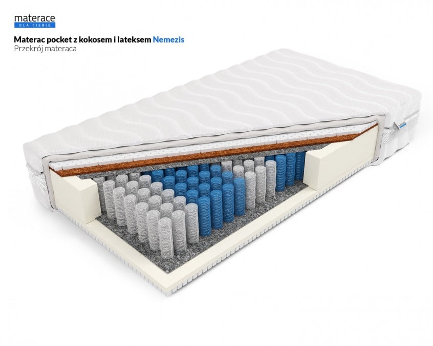 Materac Nemezis jest materacem wykonanym ze sprężyn kieszeniowych oraz lateksu. Pianka lateksowa ze względu na swoją elastyczność, doskonale dopasowuje się do kształtu ciała i zapewnia prawidłową pozycję kręgosłupa podczas spania. Dzięki swojej budowie materac Nemezis świetnie sparwadza się u osób z problemami i bólami kręgosłupa.