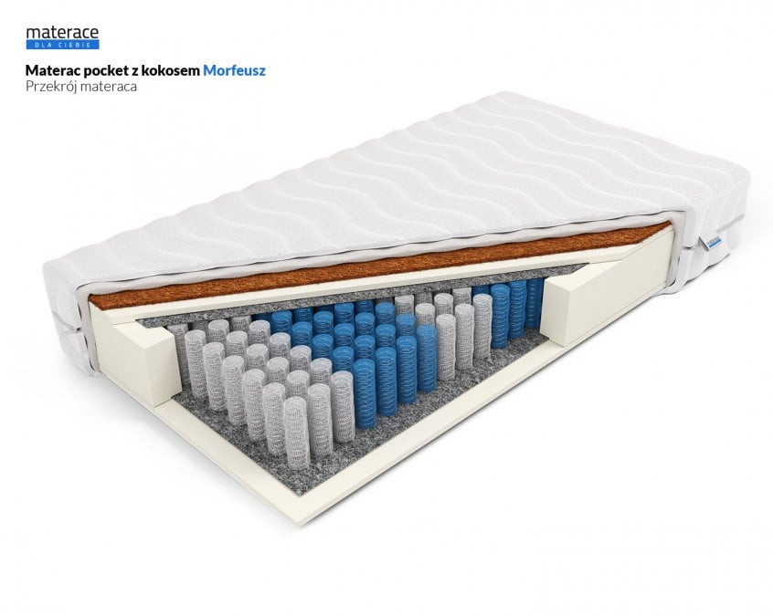 Materac Morfeusz łączy w sobie system sprężyn kieszeniowych w ilości 272 sztuk na metr kwadratowy, wysokiej jakości piankę poliuretanową oraz matę kokosową. Grubość wkładu materaca wynosi 17 cm. Łączna wysokość materaca zależeć będzie od wybranego pokrowca. Sprężyny o różnym stopniu twardości zostały rozmieszczone w 7 strefach, tak aby zapewnić odpowiednie oparcie poszczególnym częściom ciała. Każda sprężyna została zapakowana w oddzielną kieszeń, dzięki czemu materac ugina się tylko w miejscach, na które wywierany jest nacisk. Produkcja materaca następuje w ciągu 24h od zaksięgowania wpłaty za zamówienie. Produkt objęty jest 10 letnią gwarancją na wkład sprężynowy.
