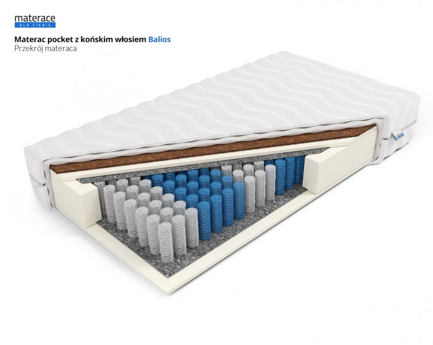 Materac Balios jest to model zbudowany ze sprężyn kieszeniowych, pianki ComfortBase (pianki poliuretanowej) oraz maty z końskiego włosia lateksowanego. W swojej strukturze posiada on ok. 272 sprężyn na metr kwadratowy, dzięki czemu dosonale dopasowuje się do sylwetki. Materac został obustronnie wyposażony w warstwy z Pianki ComfortBase. Formatka kieszeniowa został podzielona na 7 stref twardości, które poprzez zróżnicowaną twardość idealnie podpierają poszczególne części ciała. Grubość wkładu materaca wynosi 16 cm. Łączna wysokość materaca zależeć będzie od wybranego pokrowca. Produkcja materaca następuje w ciągu 24h od zaksięgowania wpłaty za zamówienie. Produkt objęty jest 10-letnią gwarancją na wkład sprężynowy.