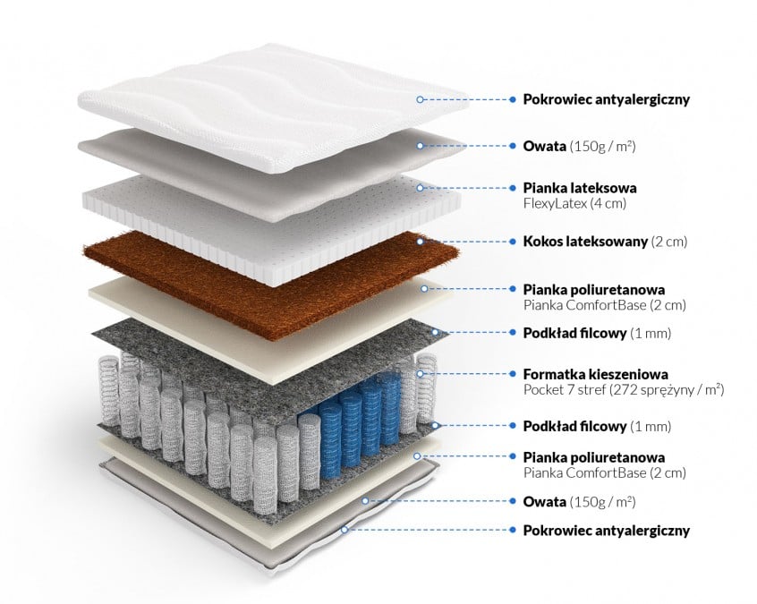 Sprężyny kieszeniowe ułożono w 7 strefach komfortu, dzięki czemu kręgosłup zyskuje ergonomiczne podparcie.