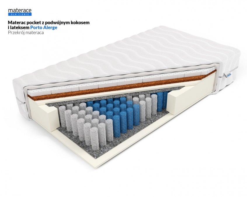 Materac Porto Alegre zbudowany jest z formatki kieszeniowej 7 stref (272 sprężyny/m2), kokosu lateksowanego z elastyczną i dopasowującą się do ciała pianką FlexyLateks o grubości 4 cm. Grubość wkładu materaca wynosi 22 cm. Łączna wysokość materaca zależeć będzie od wybranego pokrowca. Sprężyny o różnym stopniu twardości zostały rozmieszczone w 7 strefach, tak aby zapewnić odpowiednie podparcie poszczególnym częściom ciała. Każda sprężyna została zapakowana w oddzielną kieszeń, dzięki czemu materac ugina się tylko w punktach nacisku. Produkcja materaca następuje w ciągu 24h od zaksięgowania wpłaty za zamówienie. Produkt objęty jest 10 letnią gwarancją na wkład sprężynowy.