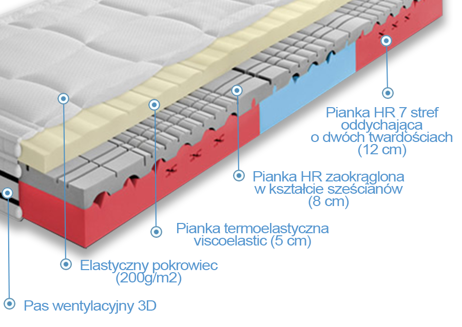 Główny wkład materaca wykonano z pianki wysokoelastycznej AVENA o grubości 12 cm, ułożonej w trzech segmentach o różnej gęstości. Sprawia to, że materac jest wysoce ergonomiczny i doskonale dopasowuje się do sylwetki. Pianka AVENA jest wysokiej jakości i charakteryzuje się elastycznością oraz dużym stopniem przewiewności. Środkowa część materaca została wykonana z zimnej pianki o grubości 8 cm. Jest ona podzielona na 7 stref twardości. Dzięki temu każda partia ciała ma zapewnione odpowiednie podparcie. Specjalna technologia produkcji pianki zapewnia perfekcyjnie dopasowanie do kształtu ciała i odpowiednią wentylację materaca. Górna warstwa materaca została stworzona z pianki termoelastycznej Visco o grubości 5 cm. Pianka ta pod wpływem temperatury ciała i nacisku doskonalne dopasowuje się do kształtu sylwetki. Niweluje ona wszelkie uciski w okolicach bioder czy karku, co będzie dobrym rozwiązaniem przy problemach z krążeniem. Materac posiada właściwości ortopedyczne oraz antyalergiczne.