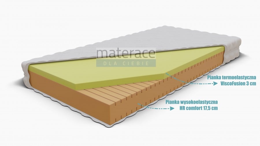 Materac Izyda został wykonany z połączenia dwóch wysokiej jakości pianek: wysokoelastycznej HR Comfort oraz 3 centymetrowej warstwy pianki termoelastycznej ViscoFusion. Bazę materaca stanowi bardzo trwała na odkształcenia pianka wysokoelastyczna o grubości 17,5cm. Materac przeznaczony jest do użytku obustronnego, możemy przekładać go i spać zarówno od strony pianki HR jak i pianki termoelastycznej.