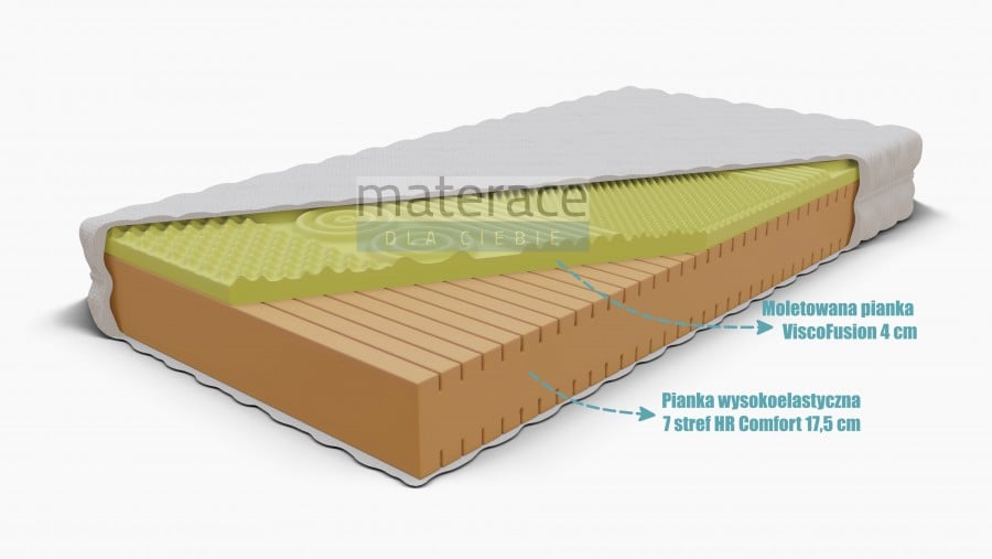 Tumnus to materac zbudowany z połączenia dwóch wysokiej jakości pianek: wysokoelastycznej HR Comfort (17,5 CM) oraz pianki memory ViscoFusion (4 CM). Wysokość materaca wynosi 22,5cm.