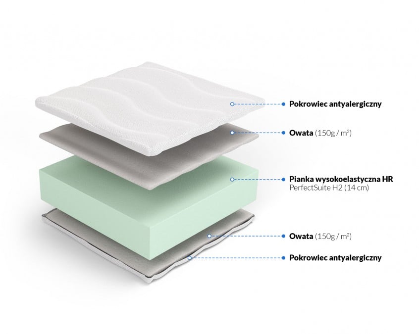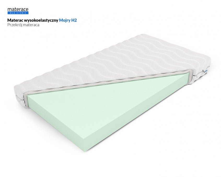 Materac Mojry H2 to model piankowy, w całości zbudowany z pianki wysokoelastycznej HR FreshElastic. Grubość wkładu materaca wynosi 14 cm. Łączna wysokość materaca zależy od wybranego pokrowca. Produkcja materaca wynosi 24h od zaksięgowania środków na naszym koncie. Produkt objęty jest 2-letnią gwarancją.