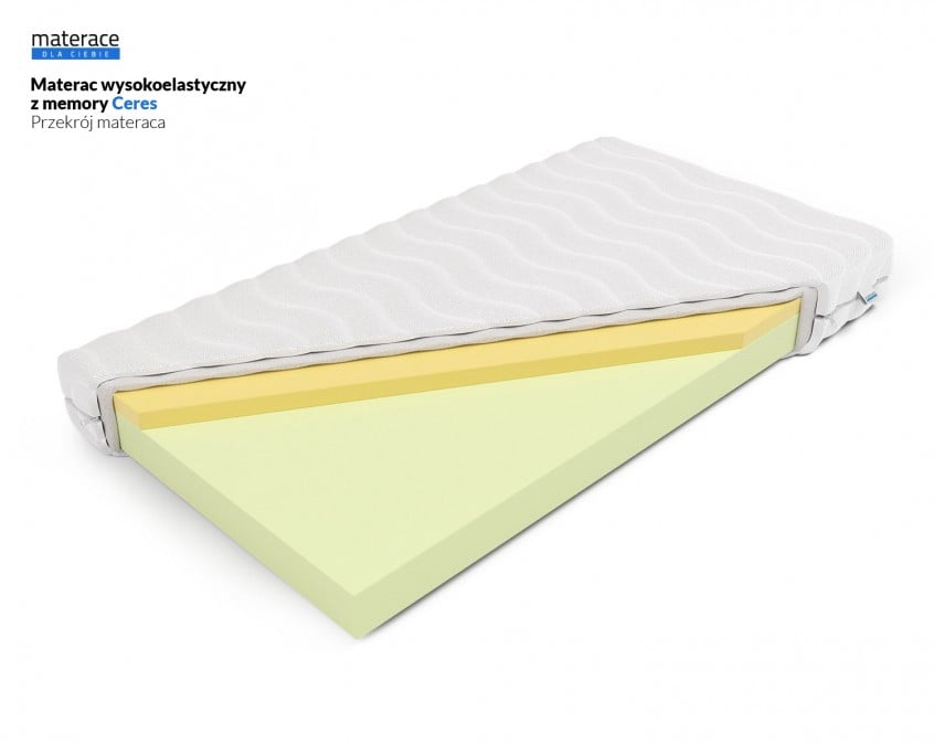 Bazą materaca Ceres jest pianka wysokoelastyczna HR FreshElastic, która jest bardzo sprężysta i elastyczna. Szybko reaguje na nacisk podczas zmiany pozycji w czasie snu. Materac jest polecany dla osób, które mają problemy z kręgosłupem. Dodatkowo jest antyalergiczny i antygrzybiczny. Wkład z pianki wysokoelastycznej HR FreshElastic zapewnia doskonałą wentylację w czasie użytkowania. W materacu Ceres zastosowano piankę PerfectSuite (VISCO/memory), która reaguje zarówno na nacisk jak i temperaturę ludzkiego ciała. W czasie snu pianka idealnie dopasowuje się do indywidualnej budowy ciała. Zapewnia optymalne podparcie dla każdej części ciała. Pianka memory powoduje, że materac jest bardziej miękki, zapewniając przy tym idealne podparcie dla kręgosłupa. Materac nie przenosi drgań – model ten polecamy dla par, ponieważ nie są odczuwane ruchy drugiej osoby na materacu.
