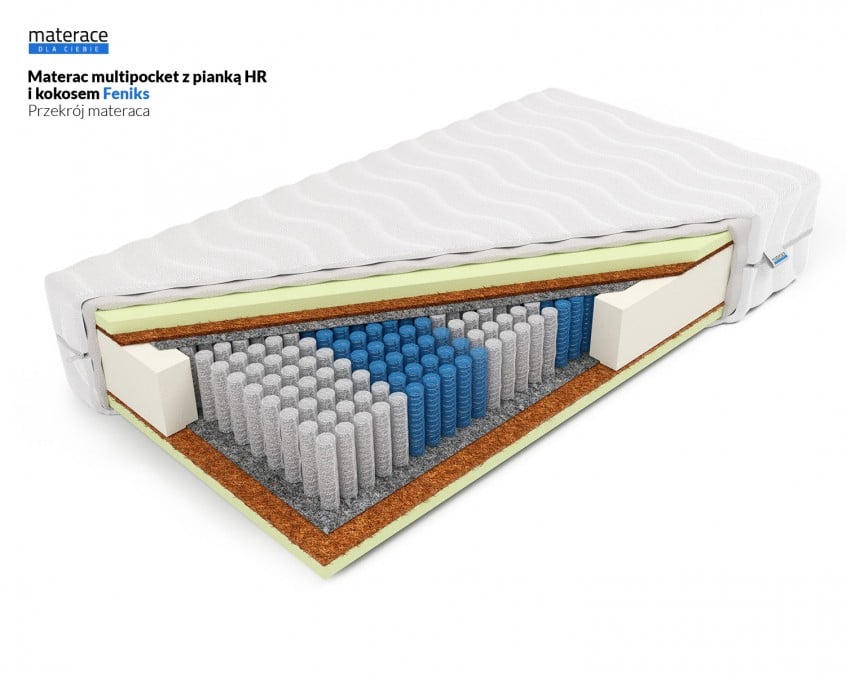 Materac Feniks jest to model zbudowany z Formatki kieszeniowej MultiPocket 7 stref w ilość 508 szt. sprężyn na m2 oraz obustronnej wysokiej jakości pianki HR FreshElastic o grubości 4cm. Dodatkowo po obu stronach materaca, pod pianką HR FreshElastic zostało zastosowane 1cm kokosu lateksowanego, który utwardza powierzchnię spania. Sprężyny o różnym stopniu twardości zostały rozmieszczone w 7 strefach, tak aby zapewnić odpowiednie podparcie poszczególnym częściom ciała. Każda sprężyna została zapakowana w oddzielną kieszeń, dzięki czemu materac ugina się tylko w punktach nacisku. Grubość wkładu materaca wynosi 22 cm. Łączna wysokość materaca zależeć będzie od wybranego pokrowca. Produkcja materaca następuje w ciągu 24 godzin roboczych od zaksięgowania wpłaty za zamówienie. Produkt objęty jest 5-letnią gwarancją na wkład sprężynowy.