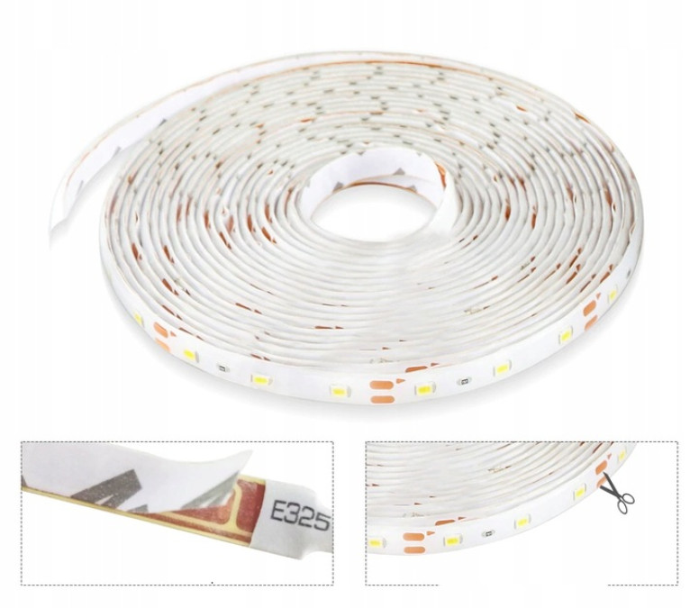 Taśmy i czujniki montuje się za pomocą taśmy dwustronnej, którą pokryte są od spodu. Taśmę można skracać co 3 diody czyli ok. 10cm.