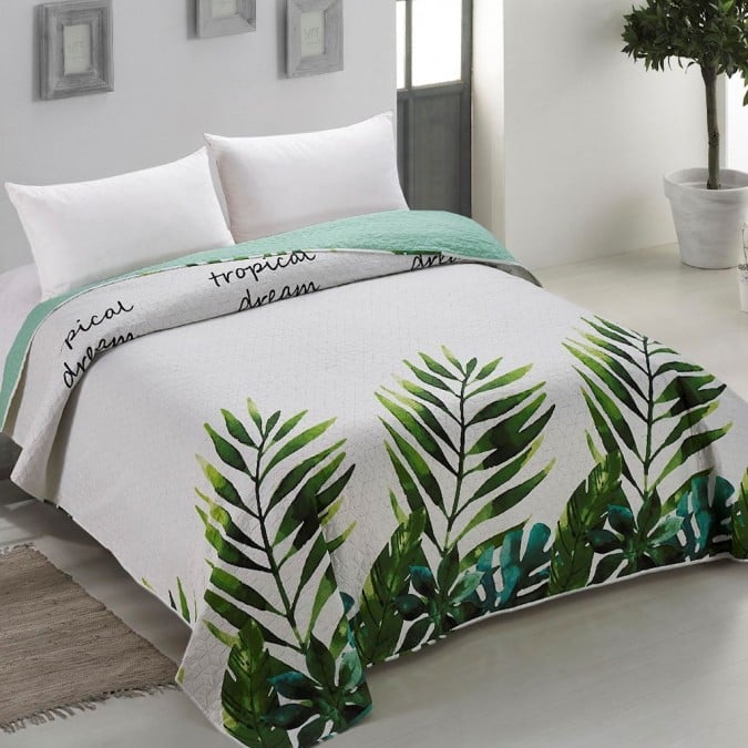 Wykonana z najwyższą starannością narzuta TROPIKALNY SEN to idealny wybór dla wszystkich tych, którzy w sypialni lubią otaczać się intensywną, głęboką zielenią. Imponujących rozmiarów motyw roślinny zestawiony został z gładkim, jasnym tłem. Dzięki temu zabiegowi, kompozycja prezentuje się nadwyraz świeżo i orzeźwiająco. Aksamitnie miękki materiał zachwycająco układa się na materacu, nie tylko chroniąc go przed…